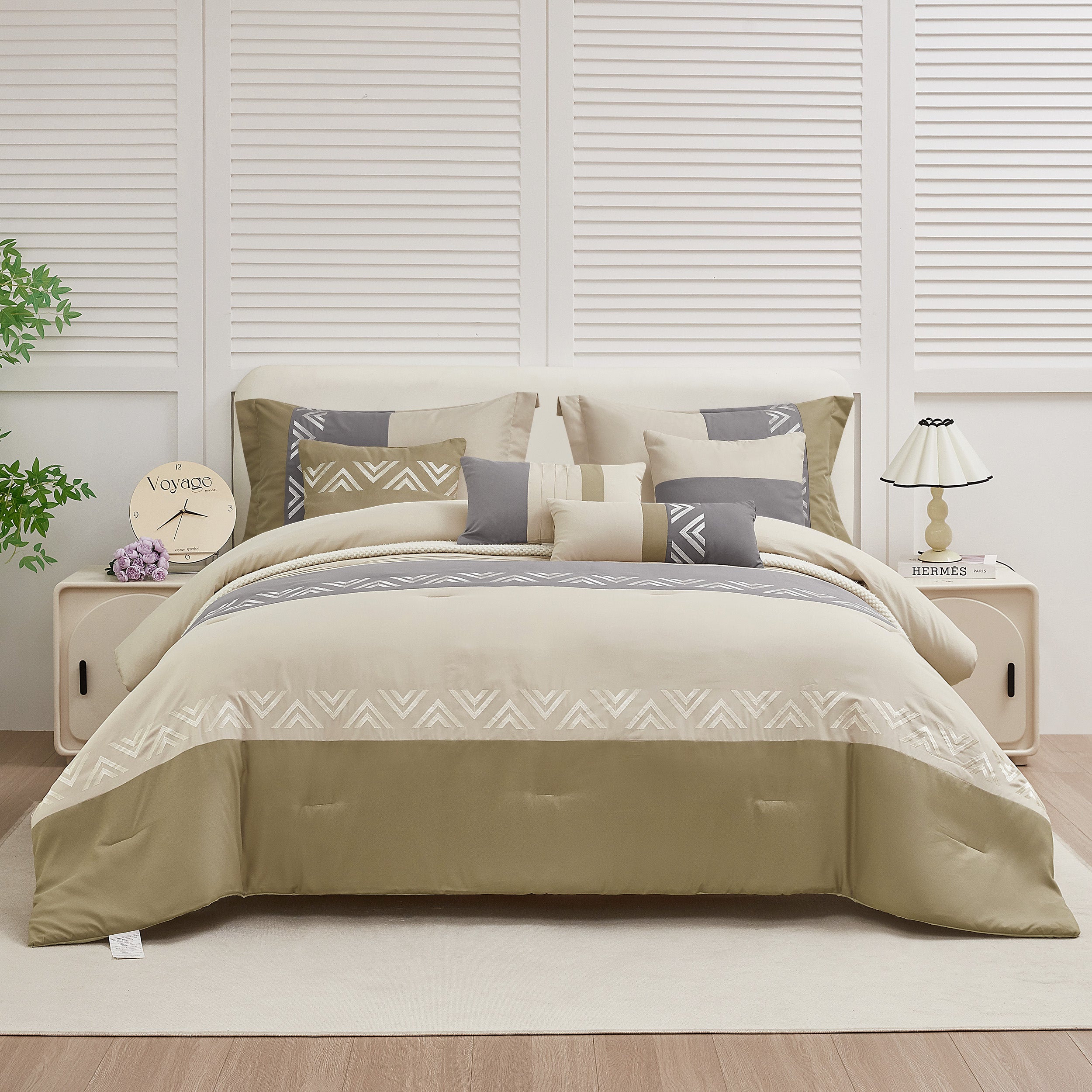 The 8 pcs modern comforter set has everything you need to complete a bedroom decor makeover, saving you time and effort in coordinating individual pieces. It can be a budget-friendly way to update your bedroom. Soft microfiber with cozy down alternative filling provides a comfortable and cozy sleeping experience. Lightweight and breathable, suitable for all season use. The comforter can be used as a duvet insert or as a stand alone comforter, 4 corner tabs make the duvet easy to put on any duvet cover. Elastic all the way around the fitted sheet. 14" fitted sheet deep pocket that fits mattress up to 14" deep.