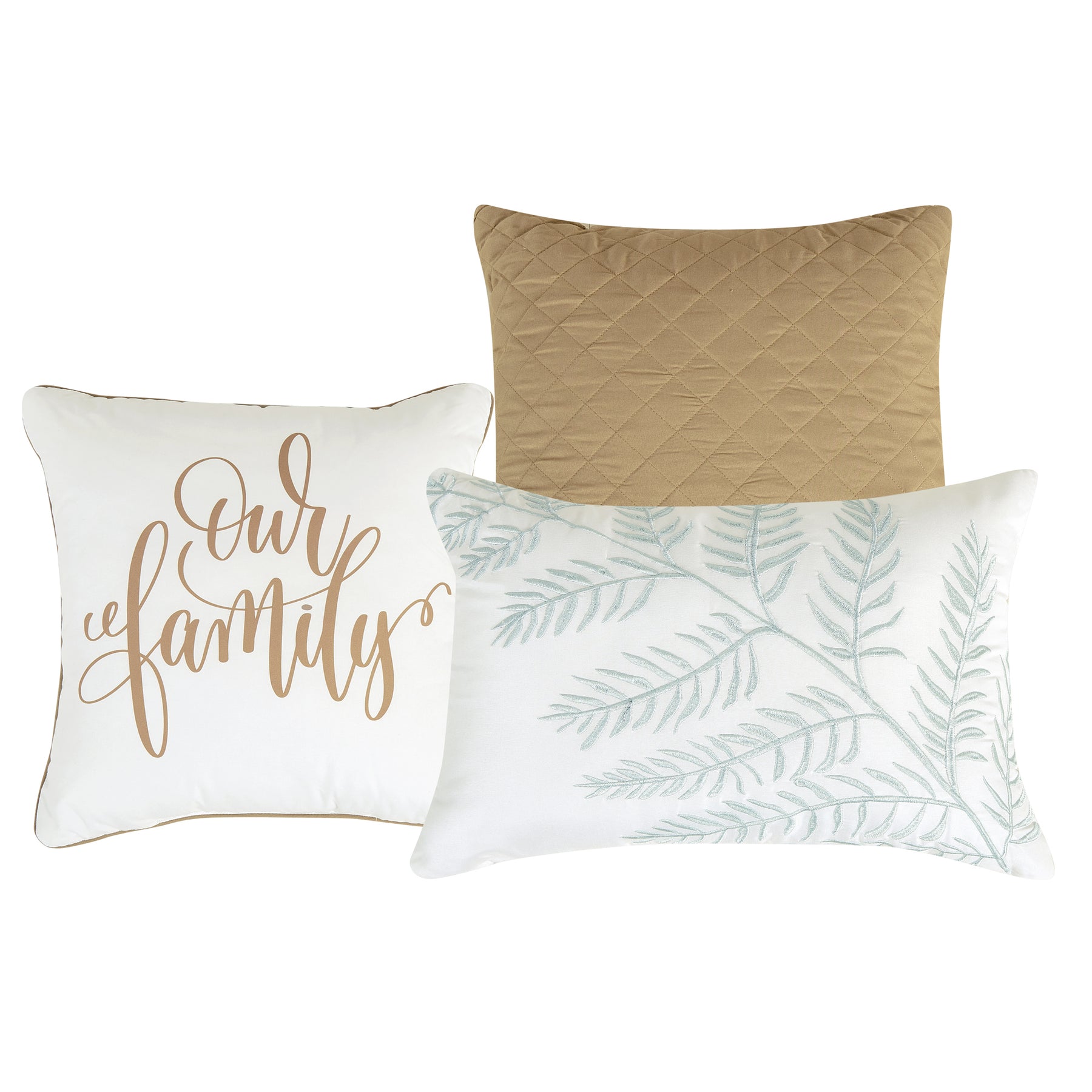 • Package Contents: Queen size comforter (90" x 90"), 2 Pillow Shams (20"x26"), two Cushions (18" x 18" and 16" x 16"), one Breakfast Pillow (12" x 18")