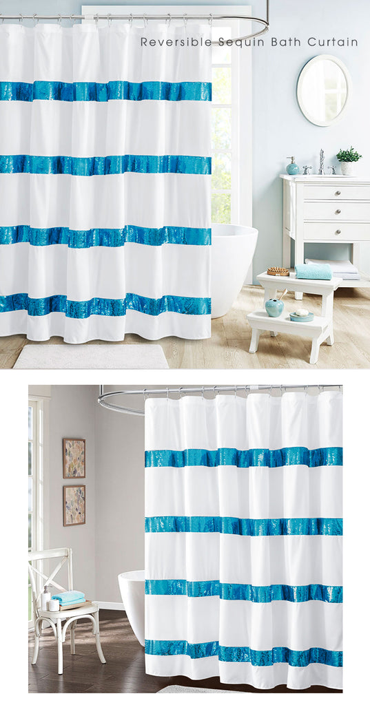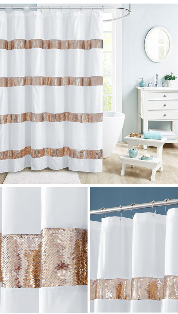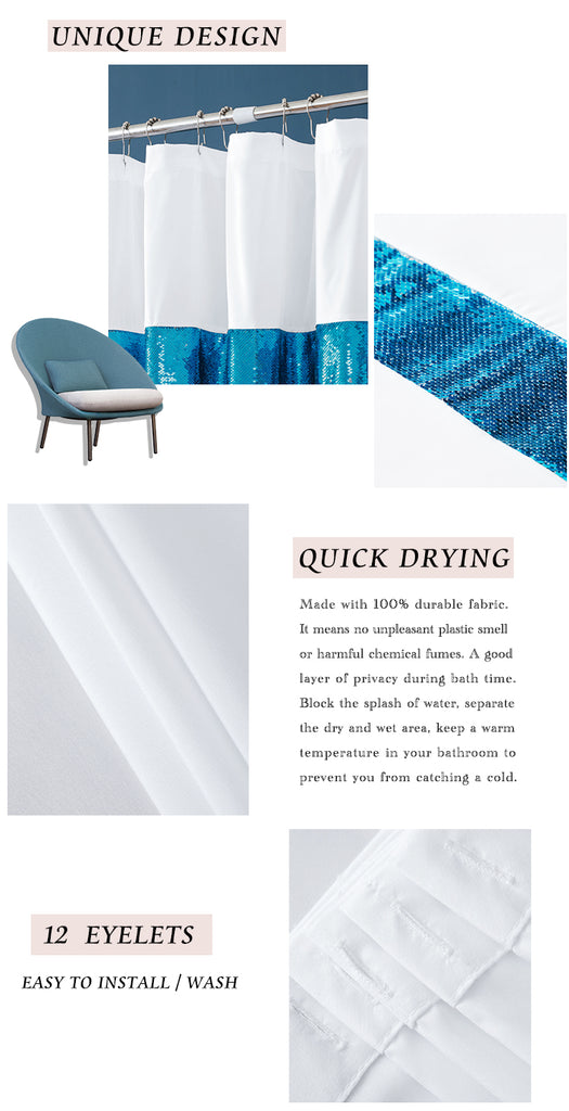 UNIQUE STYLY - Compared with traditional shower curtains, our shower curtains are featuring reversible sequin, patchwork design. exquisite workmanship, no fading, no dyes harming health of your family. And it can also decorate the room as a work of art.