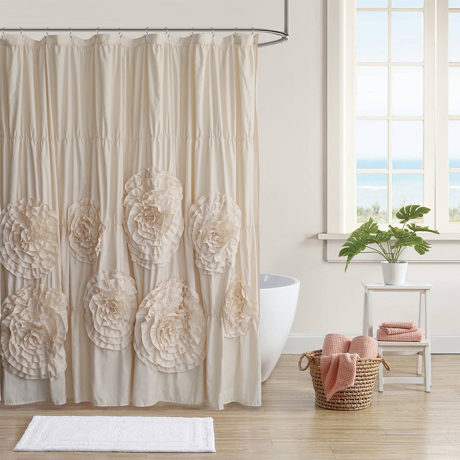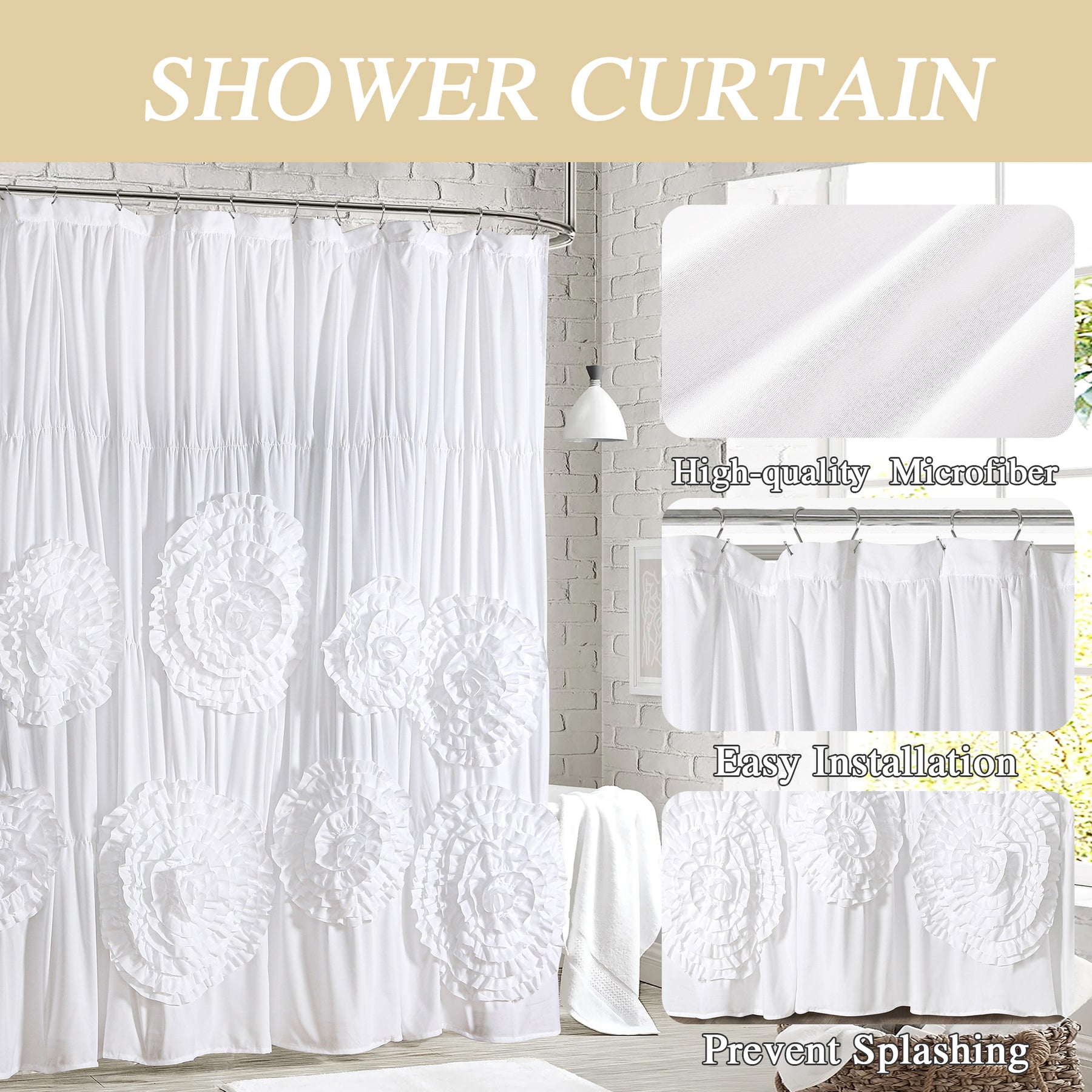 This elegant ruffled shower curtain adds a romantic floral touch to your bathroom. Featuring eight beautifully handcrafted oversized blooms on delicate ruffles, it creates a stunning focal point. The curtain includes rust-proof grommets for easy installation and versatile use - perfect as a shower curtain, window treatment, room divider, or even a photo backdrop. Made from premium brushed microfiber fabric, it's machine washable (cold, gentle cycle) and dries quickly for easy care.